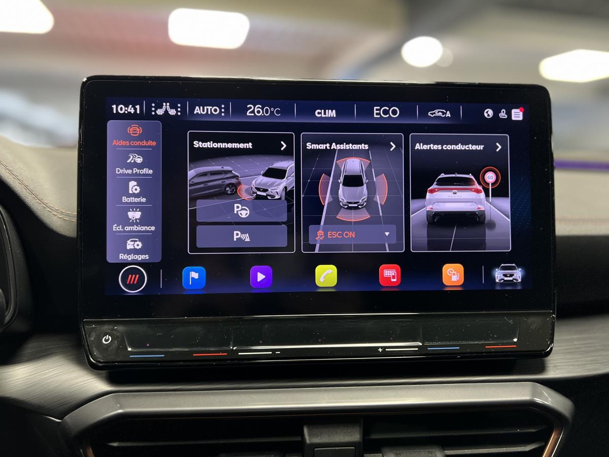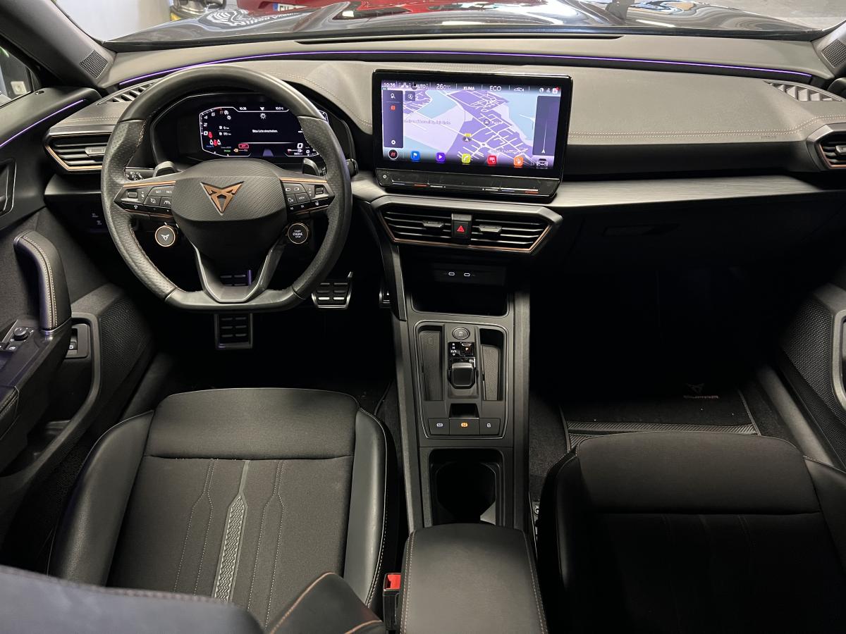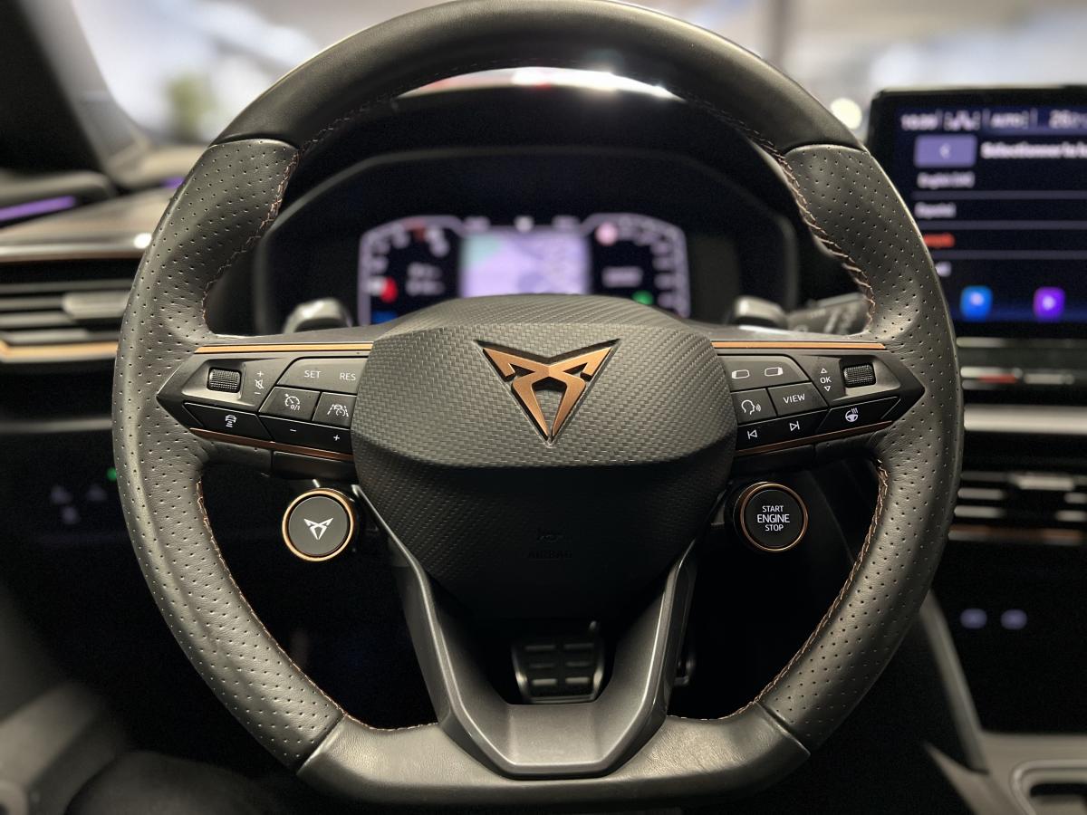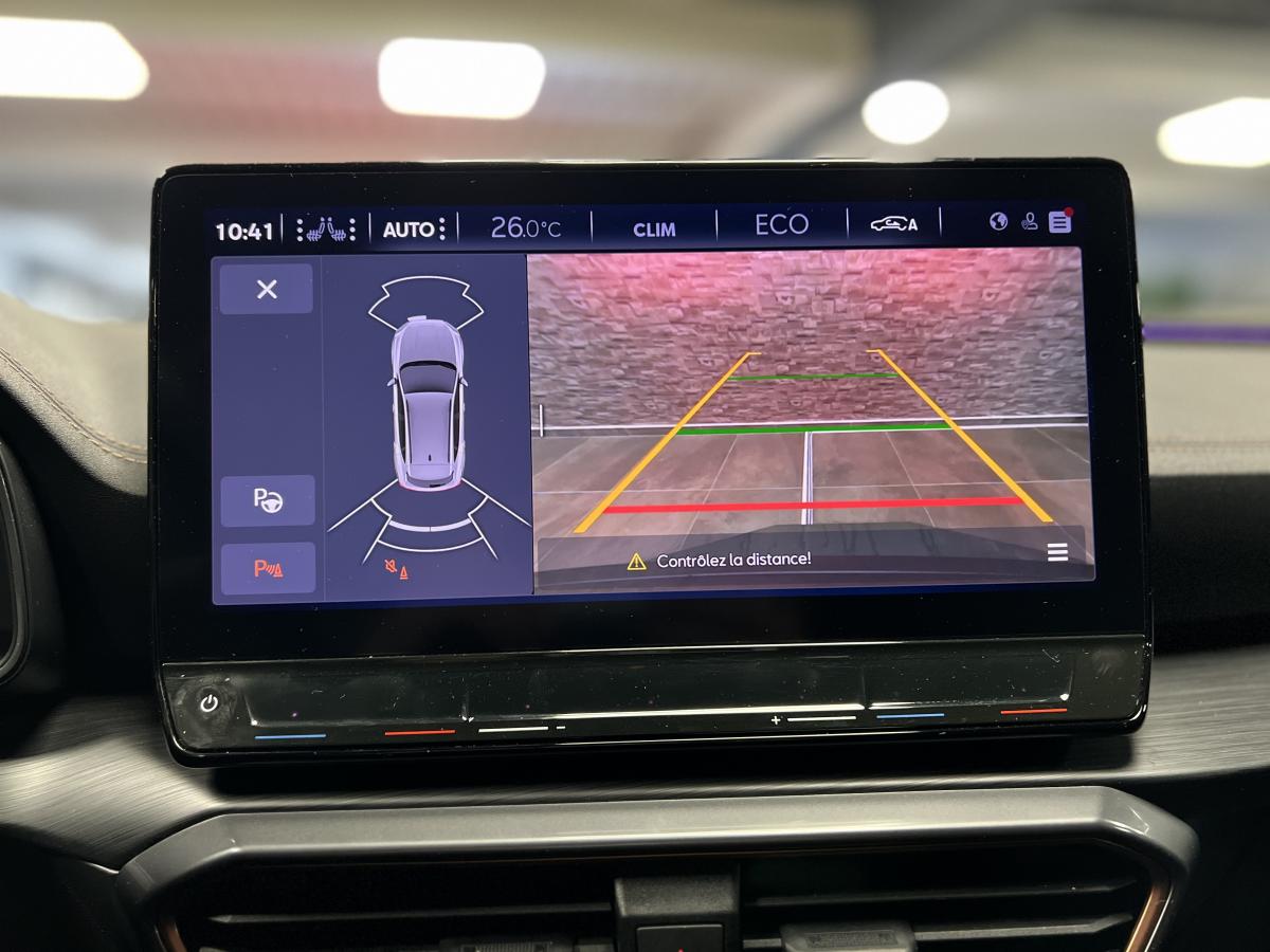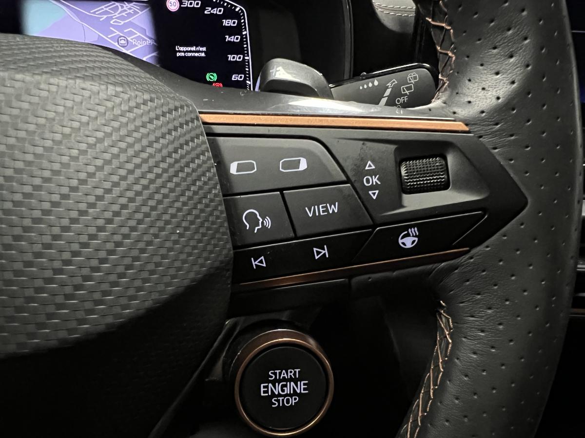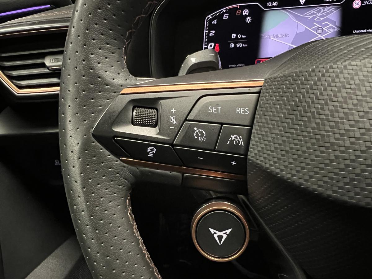2 prises USB-C éclairées à l'AV et 2 à l'ARAccès et démarrage mains-libresAccoudoir centralActive Park Assist avec aide au stationnement avantAide au stationnement arrièreAirbags frontaux , latéraux et rideauxAppel d'urgence eCallCâble de recharge pour prise domestiqueCaméra de reculCiel de pavillon noirClignotants à défilement et cérémonie de bienvenue ARClimatisation automatique Climatronic tri-zoneConnectivity Box avec chargeur à inductionCouleur contrastante Dark Alu (soubassements, élargisseurs d'ailes et coques de rétroviseurs)CUPRA BoxCupra connect Media & InternetDétecteur de pluie et de luminositéDigital cockpit 10.25’’Direction dynamiqueDossier AR rabattable 2/3 - 1/3Double-sortie d'échappement Copper rectangulaireEclairage d'ambiance personnalisableEclairage de bienvenue avec projection du logo CUPRA au solFeux arrière LED avec bandeau Infinite LightFeux de route intelligentsFixations Isofix et Toptether aux sièges arrièreFull Link avec CarPlay sans filJante alliage 19" Black SilverLampes de lecture à l'avant et à l'arrièreMiroirs de courtoisie conducteur et passager avant éclairés sur les pare-soleilsPack Drive Assist LPack extérieur Cupra avec entourages de vitres Noir PianoPack intérieur Copper avec inserts Dark AluProjecteurs anti-brouillard avec Cornering Light et Coming HomeProjecteurs Full LEDRadio Numérique DABRails de toit Noir PianoRéglage en hauteur et lombaire des sièges avantRégulateur de vitesse adaptatif et prédictif 'ACC' jusqu’à l’arrêt completRégulation adaptative du chassis DCCRétroviseur intérieur électrochromeSeuils de porte CUPRA rétro-éclairésSièges baquets Cupra en textile Noir AsphalteSign AssistSystème audio 7 HP avec contrôle vocal "Hola Hola"Système de navigation 3D sur écran tactile HD 12"Tapis de sol spécifiques Premium CupraVitres arrière surteintées