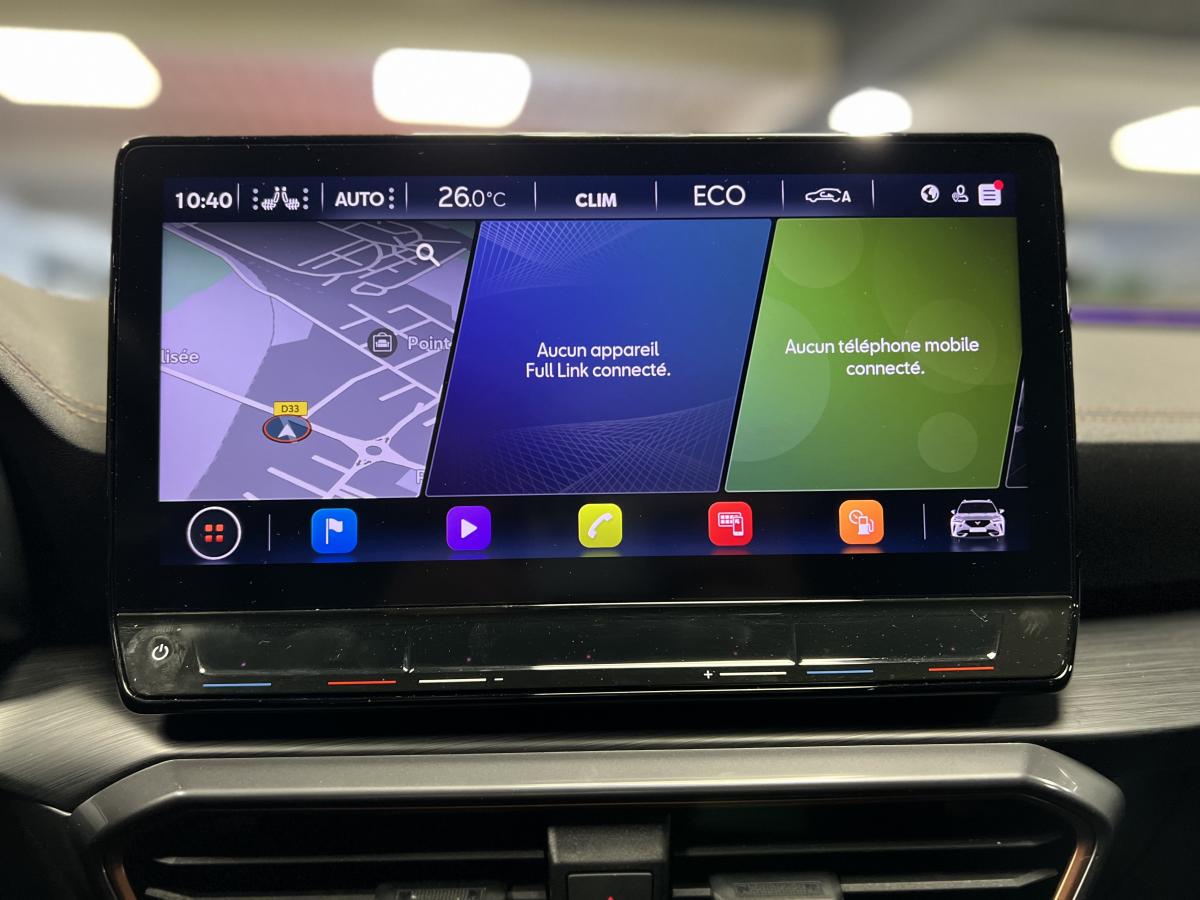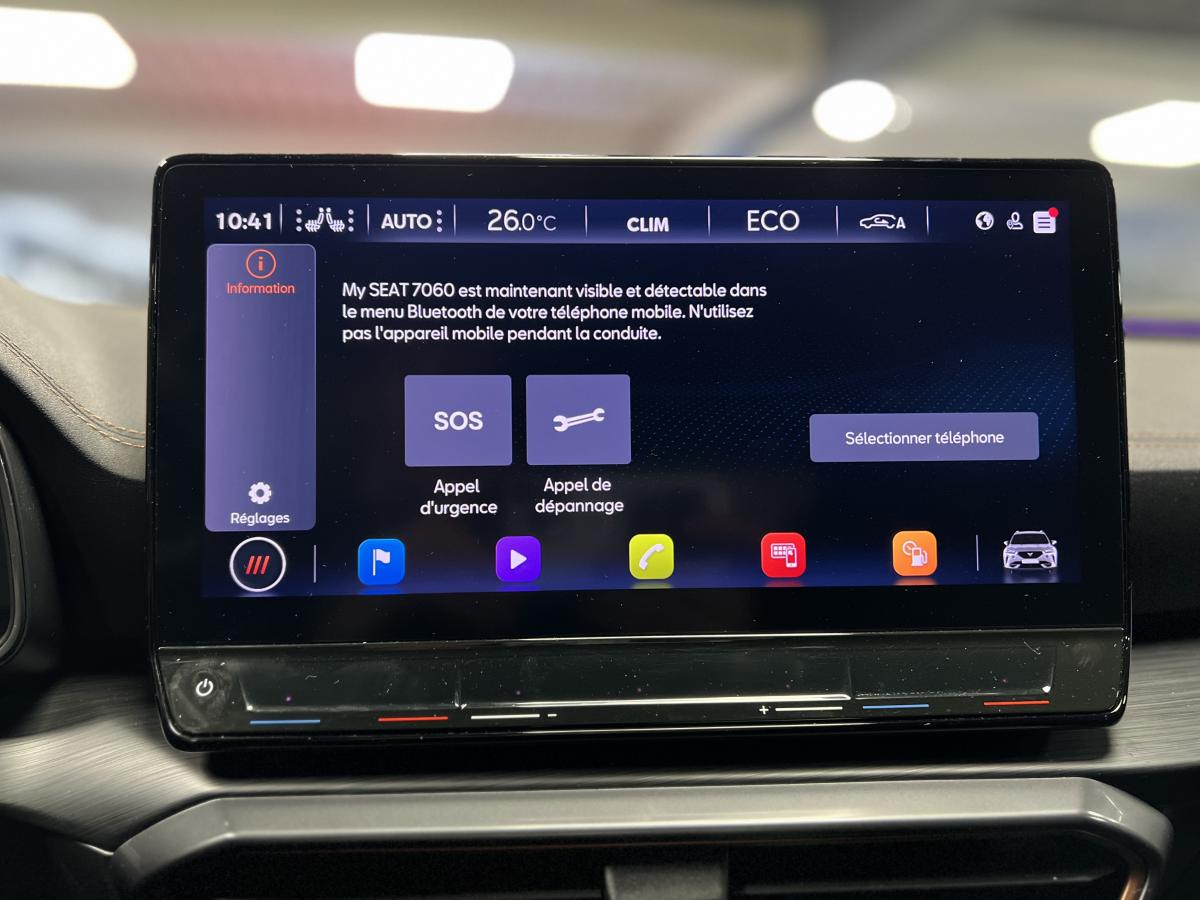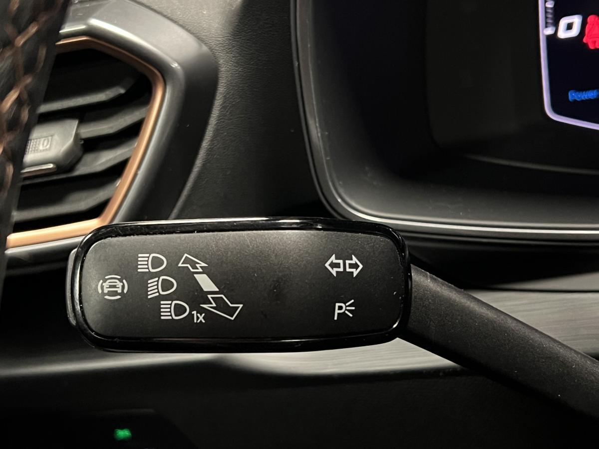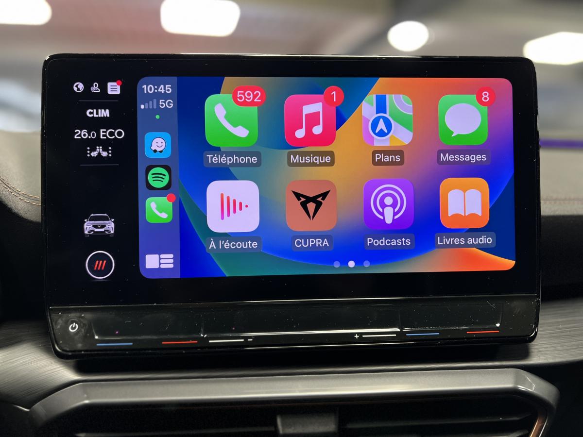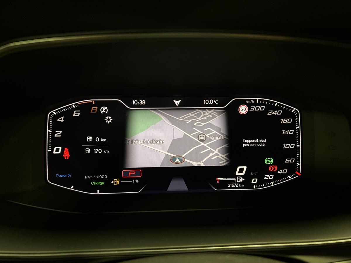 2 prises USB-C éclairées à l'AV et 2 à l'ARAccès et démarrage mains-libresAccoudoir centralActive Park Assist avec aide au stationnement avantAide au stationnement arrièreAirbags frontaux , latéraux et rideauxAppel d'urgence eCallCâble de recharge pour prise domestiqueCaméra de reculCiel de pavillon noirClignotants à défilement et cérémonie de bienvenue ARClimatisation automatique Climatronic tri-zoneConnectivity Box avec chargeur à inductionCouleur contrastante Dark Alu (soubassements, élargisseurs d'ailes et coques de rétroviseurs)CUPRA BoxCupra connect Media & InternetDétecteur de pluie et de luminositéDigital cockpit 10.25’’Direction dynamiqueDossier AR rabattable 2/3 - 1/3Double-sortie d'échappement Copper rectangulaireEclairage d'ambiance personnalisableEclairage de bienvenue avec projection du logo CUPRA au solFeux arrière LED avec bandeau Infinite LightFeux de route intelligentsFixations Isofix et Toptether aux sièges arrièreFull Link avec CarPlay sans filJante alliage 19" Black SilverLampes de lecture à l'avant et à l'arrièreMiroirs de courtoisie conducteur et passager avant éclairés sur les pare-soleilsPack Drive Assist LPack extérieur Cupra avec entourages de vitres Noir PianoPack intérieur Copper avec inserts Dark AluProjecteurs anti-brouillard avec Cornering Light et Coming HomeProjecteurs Full LEDRadio Numérique DABRails de toit Noir PianoRéglage en hauteur et lombaire des sièges avantRégulateur de vitesse adaptatif et prédictif 'ACC' jusqu’à l’arrêt completRégulation adaptative du chassis DCCRétroviseur intérieur électrochromeSeuils de porte CUPRA rétro-éclairésSièges baquets Cupra en textile Noir AsphalteSign AssistSystème audio 7 HP avec contrôle vocal "Hola Hola"Système de navigation 3D sur écran tactile HD 12"Tapis de sol spécifiques Premium CupraVitres arrière surteintées