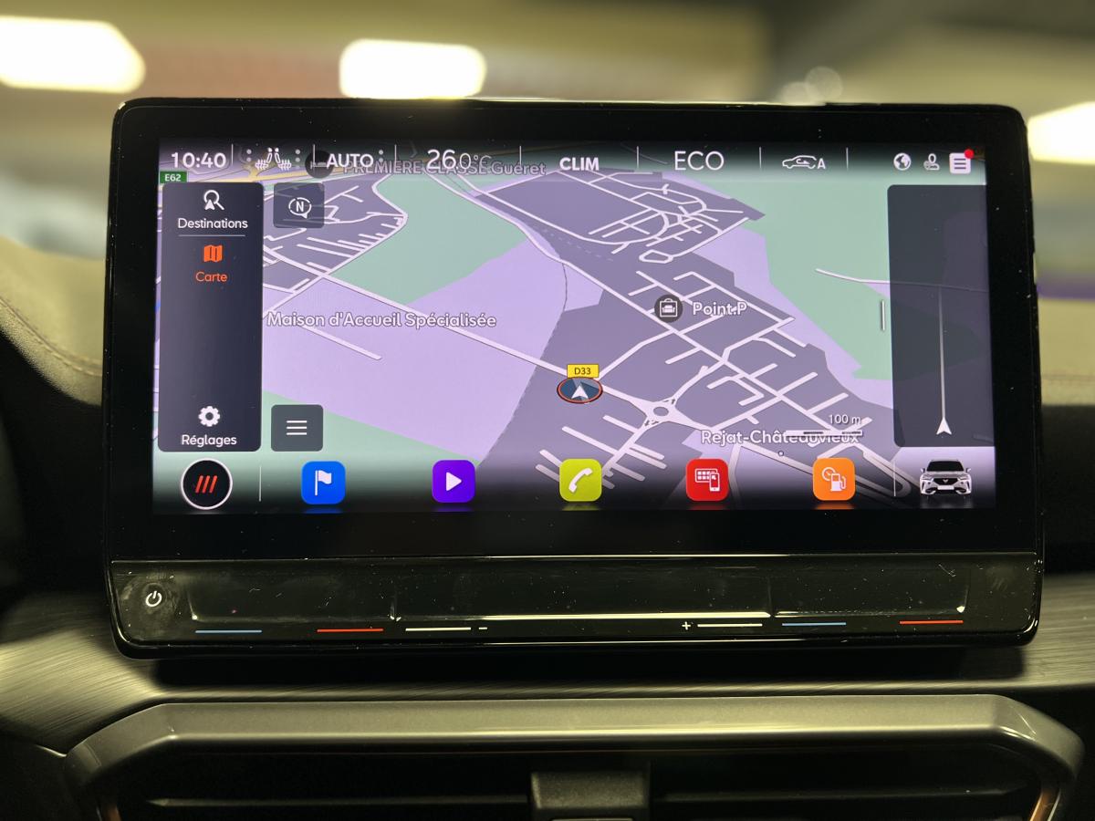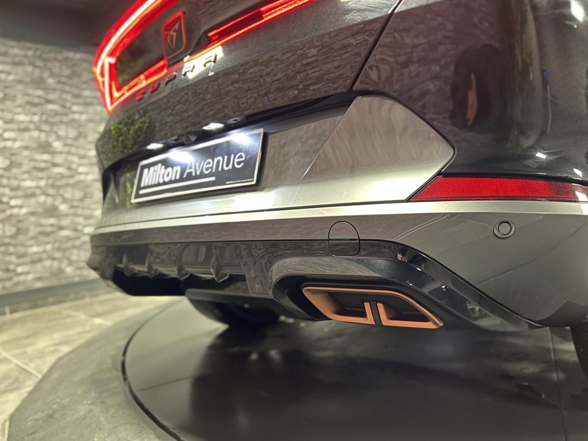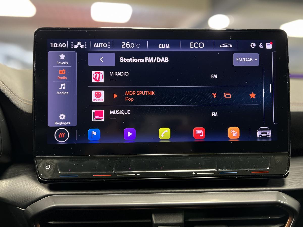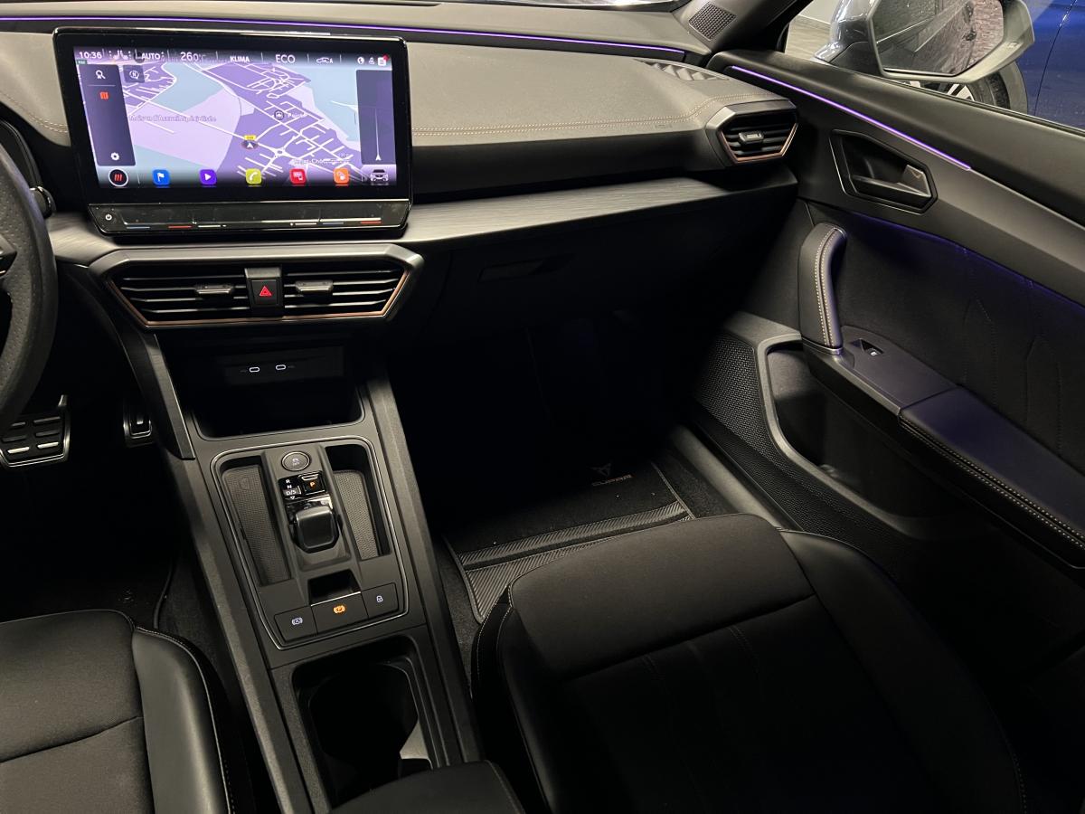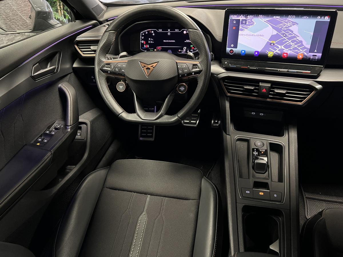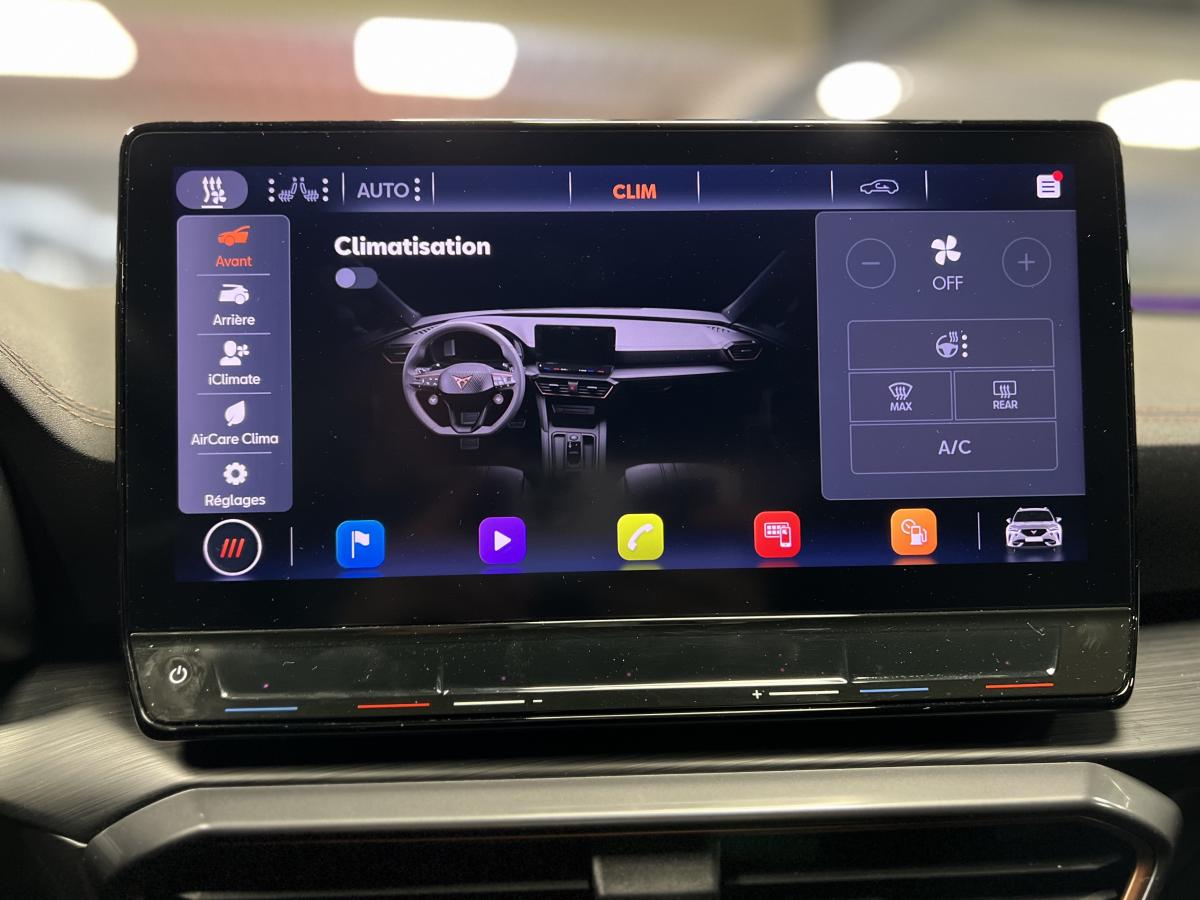 2 prises USB-C éclairées à l'AV et 2 à l'ARAccès et démarrage mains-libresAccoudoir centralActive Park Assist avec aide au stationnement avantAide au stationnement arrièreAirbags frontaux , latéraux et rideauxAppel d'urgence eCallCâble de recharge pour prise domestiqueCaméra de reculCiel de pavillon noirClignotants à défilement et cérémonie de bienvenue ARClimatisation automatique Climatronic tri-zoneConnectivity Box avec chargeur à inductionCouleur contrastante Dark Alu (soubassements, élargisseurs d'ailes et coques de rétroviseurs)CUPRA BoxCupra connect Media & InternetDétecteur de pluie et de luminositéDigital cockpit 10.25’’Direction dynamiqueDossier AR rabattable 2/3 - 1/3Double-sortie d'échappement Copper rectangulaireEclairage d'ambiance personnalisableEclairage de bienvenue avec projection du logo CUPRA au solFeux arrière LED avec bandeau Infinite LightFeux de route intelligentsFixations Isofix et Toptether aux sièges arrièreFull Link avec CarPlay sans filJante alliage 19" Black SilverLampes de lecture à l'avant et à l'arrièreMiroirs de courtoisie conducteur et passager avant éclairés sur les pare-soleilsPack Drive Assist LPack extérieur Cupra avec entourages de vitres Noir PianoPack intérieur Copper avec inserts Dark AluProjecteurs anti-brouillard avec Cornering Light et Coming HomeProjecteurs Full LEDRadio Numérique DABRails de toit Noir PianoRéglage en hauteur et lombaire des sièges avantRégulateur de vitesse adaptatif et prédictif 'ACC' jusqu’à l’arrêt completRégulation adaptative du chassis DCCRétroviseur intérieur électrochromeSeuils de porte CUPRA rétro-éclairésSièges baquets Cupra en textile Noir AsphalteSign AssistSystème audio 7 HP avec contrôle vocal "Hola Hola"Système de navigation 3D sur écran tactile HD 12"Tapis de sol spécifiques Premium CupraVitres arrière surteintées