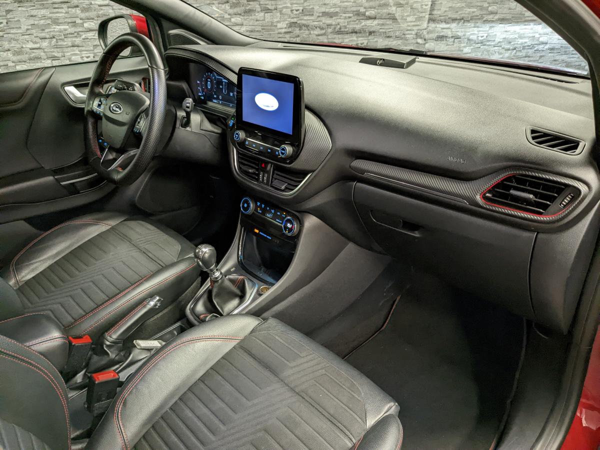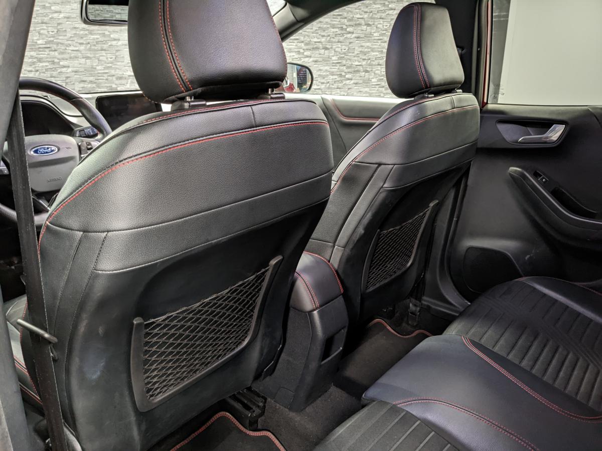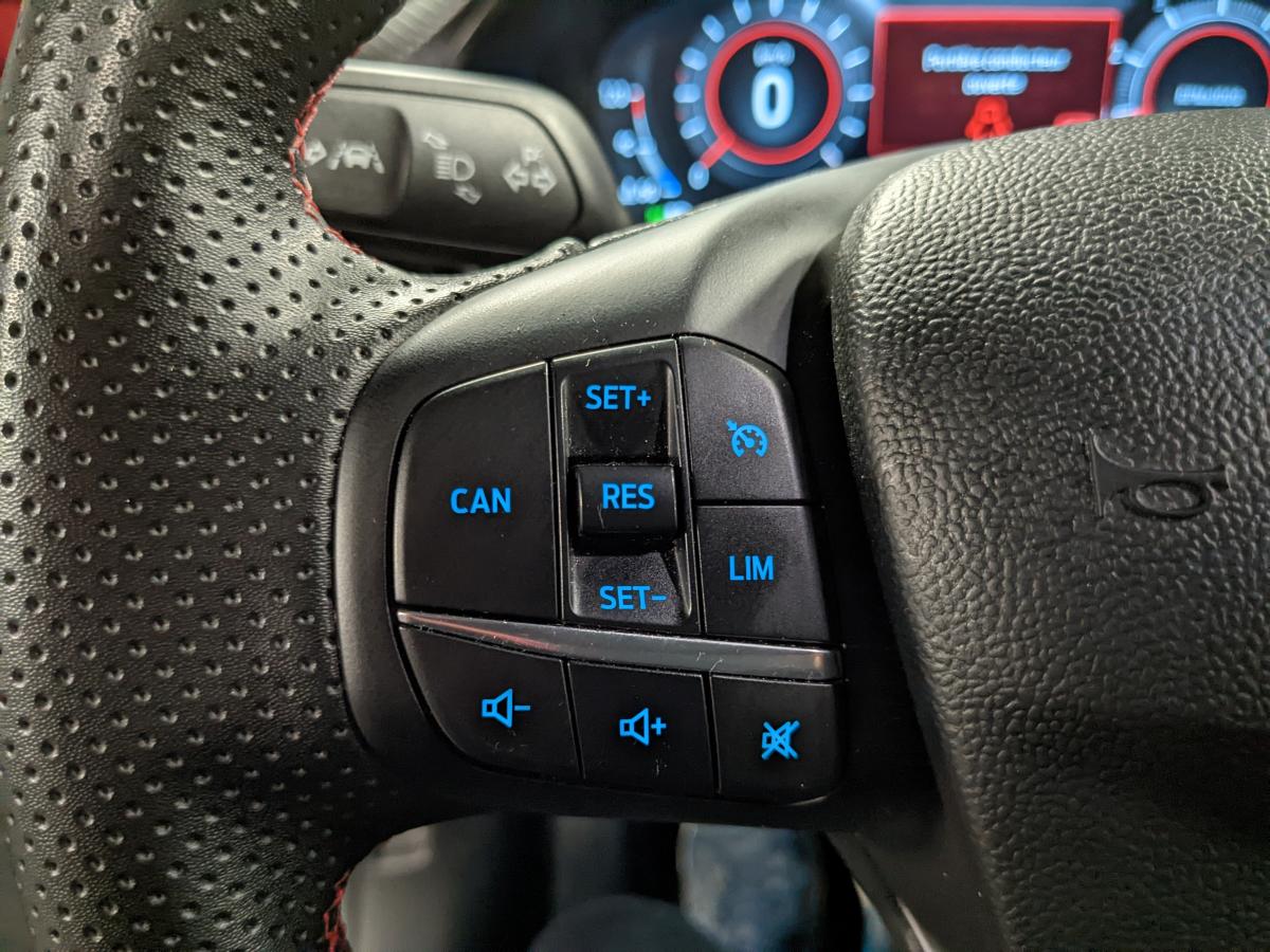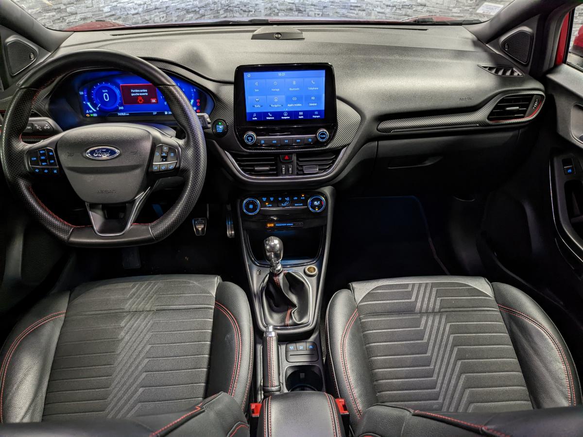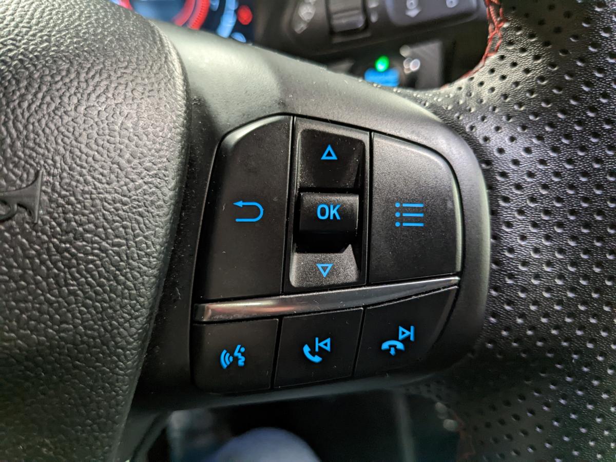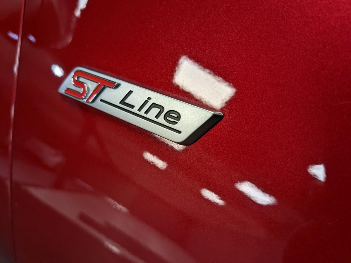2 Fixations Isofix à l'arrière3ème appuie-tête arrière5 ceintures de sécurité 3 points5 Modes de conduite sélectionnables (normal, eco, sport, faible adhérence, trail)Aide au démarrage en côteAide au maintien dans la voie avec détection des bas-côtésAide au stationnement arrièreAirbags frontaux, latéraux (thorax) et rideauxAlerte d'oubli de ceintures avant/arrièreAlerte de franchissement Involontaire de ligneAllumage automatique des pharesBadges ST-LineBanquette rabattable 60/40Becquet arrière couleur carrosserieBouton de démarrage "Ford Power"Combiné d'instrumentation numérique 12,3" avec EcomodeConsole centrale avant avec deux porte-gobelets rétroéclairésConsole centrale avec accoudoir et rangementsContour des vitres latérales en noir finition brillanteCorrecteur électronique de trajectoire ESPDésactivation de l'airbag passagerDiffuseur intégré dans le pare-chocs arrièreDirection assistée électriqueEclairage d'ambiance intérieurFeux arrière à LEDFeux de jour à LEDFeux de route intelligents (passage feux de croisement/route automatique)FordPass Connect avec modem embarqué et fonction eCallFreins à disques AV et ARGrille de calandre ST-LineJantes alliage 18" 5x2 branches finition Black MattKit de réparation des pneumatiquesLevier de frein à main gainé de SensicoLevier de vitesses gainé de SensicoLimiteur de vitesse intelligentLogo MHEV sur HayonPédalier en aluminiumPack ConfortPare-brise acoustiquePare-chocs avant design ST-LinePare-chocs couleur carrosseriePeinture non-métallisée Bleu AbyssePhares avant antibrouillard avec fonction d'éclairage d'anglePlancher de coffre ajustablePlaques de seuils de portes avant ST-LinePrise 12 V sur console centrale avantRégulateur de vitesseRétroviseur intérieur électrochromeRétroviseurs extérieurs électriques couleur carrosserie, dégivrant et rabattables avec rappels de clignotantsSellerie Mixte noire tissu Tire on Casual et Sensico SalernoSièges avant massantsSièges avant réglables en hauteur avec soutien lombaireSortie d'échappement chroméeSuspensions sportSystème audio B&O avec radio numérique DAB, SYNC 3 avec écran tactile 8", commandes vocales, 2 ports USB, compatible AppLink, Apple CarPlay et Android auto, 10 hauts-parleursSystème de chargement du smartphone par inductionSystème de Navigation Europe et points d'intérêt MichelinSystème de prévention de collision avec freinage post-collision et détection piétonsSystème de surveillance de la pression des pneusSystème MyKey (seconde clé programmable)Tapis de sol avant et arrière avec surpiquresTrappe à carburant Ford EasyFuelVerrouillage centralisé à distanceVitres électriques avant et arrière avec descente et remontée à impulsionVitres arrière surteintéesVolant à méplat 3 branches ST-Line avec surpiqûres rouges