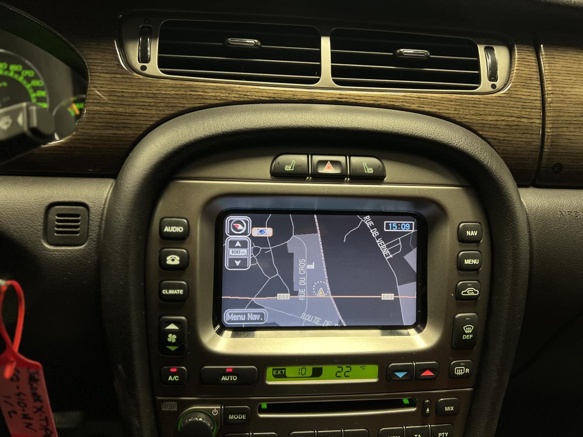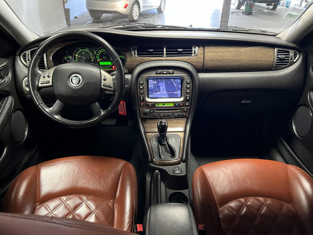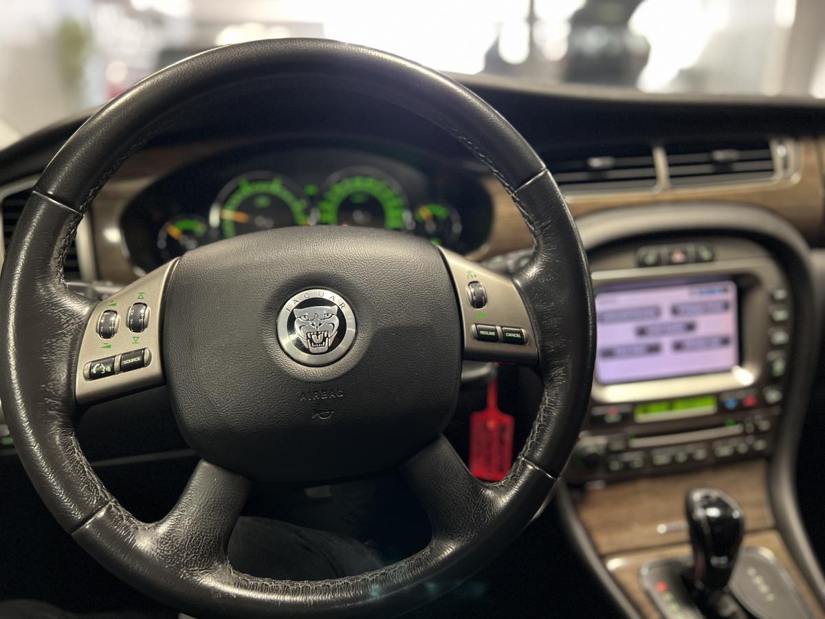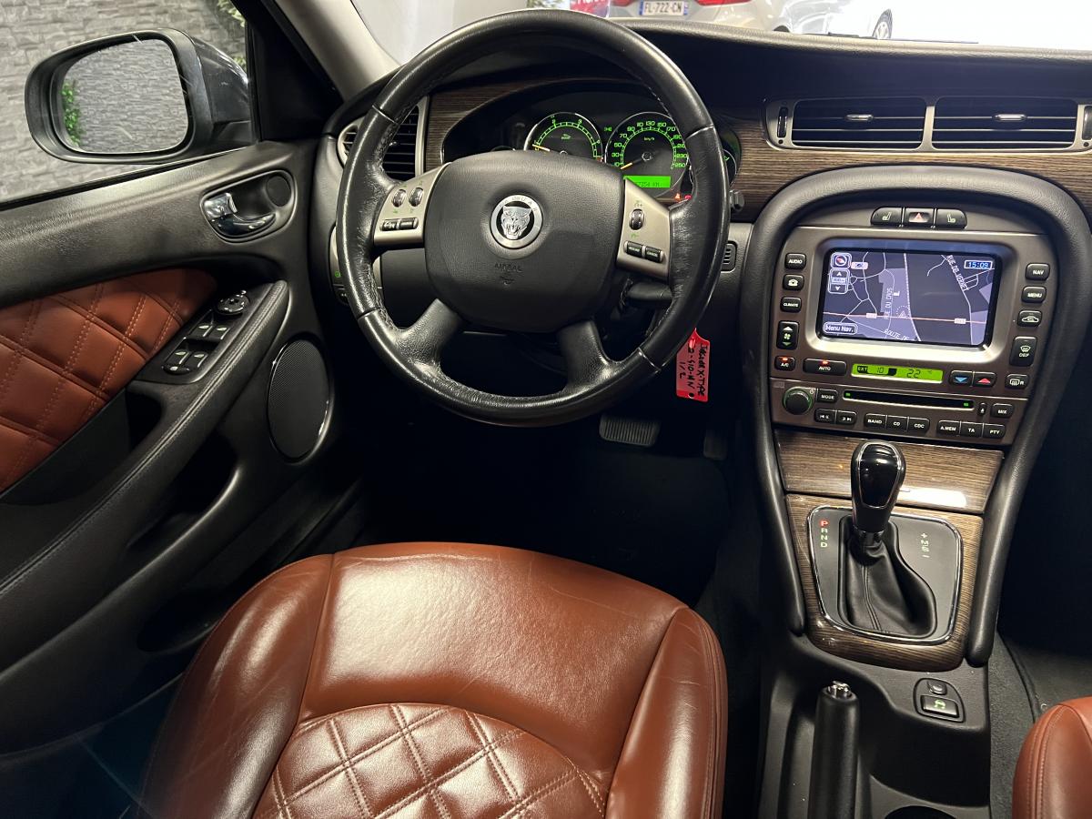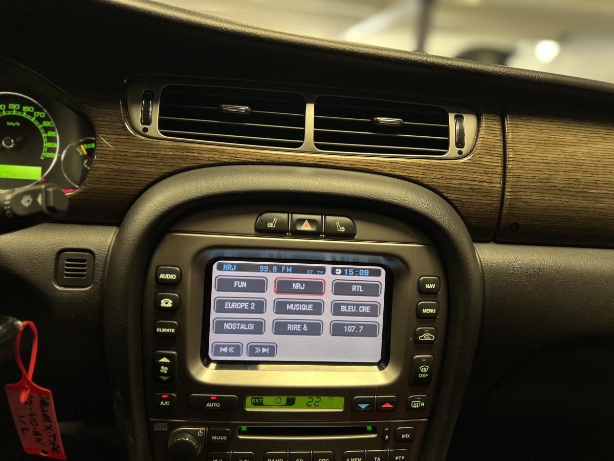 Accoudoir central arrière avec double porte-verreAllumage automatique des phares avec réglage manuel de la hauteur du faisceauAntipatinage Électronique (ETC)Bac de rangement dans la console centrale avant et accoudoir coulissantBadge Jaguar « Executive »Baguettes de porte intérieures en ronce de noyerBanquette arrière fractionnable en 70/30Boiserie ronce de noyerClimatiseur automatique avec filtre à pollen et affi chage de la température extérieureColonne de direction réglable manuellement en hauteur et en profondeurContrôle dynamique de la stabilité (DSC) avec assistance au freinage d'urgence (EBA)Direction assistée à démultiplication variable en fonction de l'angle de braquageDouble porte-verre avantEncadrement de calandre couleur carrosserie avec encadrement intérieur chroméEntourage des vitres latérales chroméEssuie vitre à déclenchement automatiqueGrille de calandre maillée brillante avec badge « tête de Jaguar » centralJantes en alliage Barbados 7" x 17"Lève-vitres électriques avant et arrière à anti-pincement, commandés par simple impulsionLecteur simple CDOrdinateur de bordPare-brise arrière chauffant à temporisationPare-soleil avec miroirs de courtoisie éclairés, conducteur et passager avantPlaques de seuil de porte à l'arrièrePommeau de levier de vitesse cuirProjecteurs antibrouillard avantRégulateur automatique de vitesse avec commandes au volantRétroviseur intérieur automatique jour/nuitRétroviseurs extérieurs chauffants et escamotables électriquementRétroviseurs extérieurs couleur carrosserie, chauffants et réglables électriquement avec rappels de clignotants intégrésSièges avant chauffants avec réglages indépendantsSièges en cuir avec double couture horizontale et passepoils contrastés, réglables électriquement en 10 directions (incluant les supports lombaires) pour les sièges conducteur et passager avantSuspension TouringSystème audio Jaguar 120WSystème d'aide au parking arrièreSystème de téléphonie BluetoothTapis de sol textile à l'avant et à l'arrièreTrois appuie-tête arrièreTrois mémorisations possibles pour les réglages du siège conducteur et des rétroviseurs extérieursVolant 4 branches multifonctions habillé de cuir avec commandes du système audio, du régulateur de vitesse, du système de téléphonie Bluetooth® (si option montée) et commandes vocales JaguarVoice®